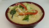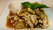 Eggplants stir-fried in creamy coconut milk and red curry sauce with onions, bell peppers and sweet basil.