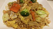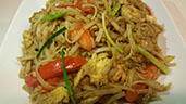 Glass noodles stir-fried with eggs, onions, tomatoes, green onions and brown sauce.
