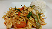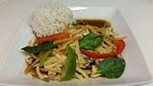 Sautéed red curry with onions, bell peppers, bamboo shoots and sweet basil.