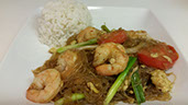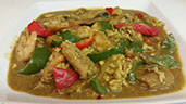 Shrimp, squid, and mussels stir-fried in coconut milk with yellow curry, eggs, onions, and bell peppers and green onions.