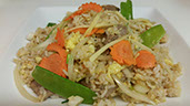 Fried rice with eggs, onions, snow peas, carrots, and fresh ginger.