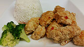Breaded chicken tempura deep fried and served with our special sweet and sour sauce and a side of broccoli.