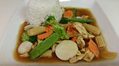 Snow peas, baby corns, broccoli, carrots, and water chestnuts sautéed in our brown house sauce to create a unique blend of flavors.
