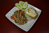 Choice of ground pork or ground chicken, stir-fried with Thai Holy Basil, onions and red bell peppers. (Topped with Thai fried egg for $1.00 extra)