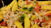 Sweet and sour mango salad with your choice of chicken or tofu. Mixed in special sauce with onions, carrots and cilantro and green onions.
