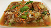 Deep fried Tilapia fillets topped with sweet basil chili sauce, and stir-fried mixture of sliced onions, carrots, bell peppers, and pineapple.